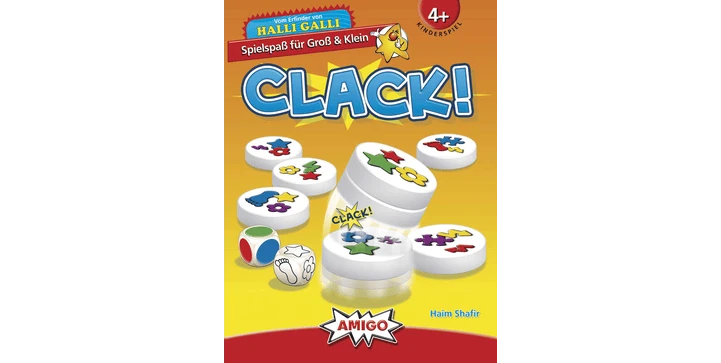 Bei Clack! spielen immer alle Spieler gleichzeitig: Einer würfelt und schon greifen alle nach den bunten, magnetischen Scheiben. Denn die Würfel geben Form und Farbe der Symbole vor, die auf den Scheiben zu sehen sein müssen. Schnell werden die richtigen Scheiben aneinander geklackt und wer am Schluss den höchsten Scheibenturm hat, gewinnt. Auf die Plätze, fertig, „Clack!“.