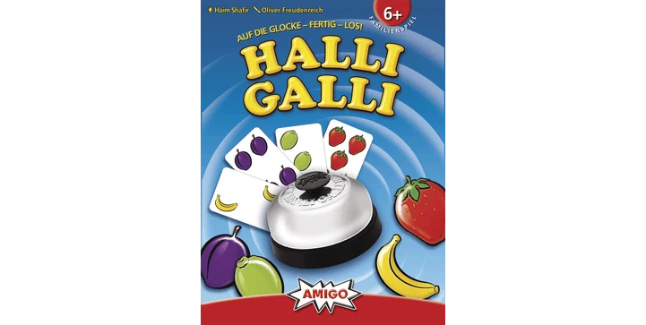Da haben wir den Salat! Ein großer Fruchtcocktail mit Bananen, Erdbeeren, Limonen und Pflaumen – das ist Halli Galli. Schnelligkeit und ein gutes Auge sind hier Trumpf. Sobald die Spieler fünf gleiche Früchte auf den ausgespielten Karten entdecken, schlagen sie schnell auf die Glocke. Aber nur bei genau fünf Früchten, also aufgepasst! Wer am Ende die meisten Karten „erklingelt“ hat, ist Sieger.