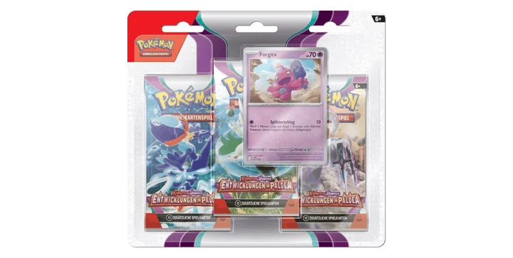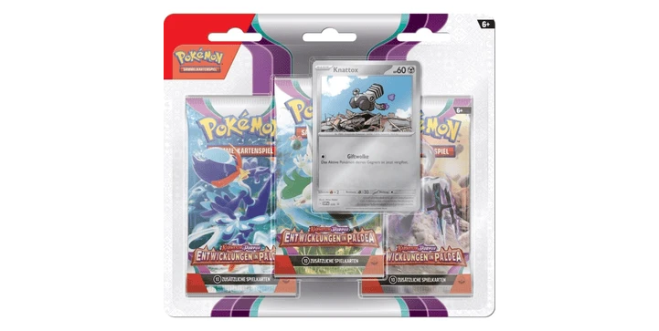 Neue Mächte erwachen, bedrohliche Legenden offenbaren sich – es herrscht Hochspannung! Die ersten Partner-Pokémon haben sich entwickelt und jetzt betreten Maskagato-ex, Skelokrok-ex sowie Bailonda-ex die Bühne mit faszinierendem Zauber, Gesang und Tanz. Forstellka, Laschoking und Dedenne glänzen derweil als Terakristall-Pokémon-ex und Baojian-ex, Dinglu-ex und andere bergen beängstigende Kräfte, deren Kontrolle viel Mut verlangt. Selbst Pikachu gesellt sich zu den Pokémon-ex in der Pokémon-Sammelkartenspiel-Erweiterung Karmesin & Purpur – Entwicklungen in Paldea!
