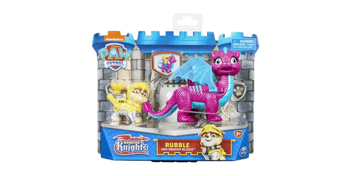 Mit den Spielfiguren-Sets mit je 1 Rubble Welpenfigur in Ritterrüstung und 1 Blizzie Drachenfigur können kleine PAW Patrol Fans ab 3 Jahren die neuen Rescue Knights Abenteuer aus der Animationsserie authentisch nachspielen. Die Geschichten lassen jedes Ritter-Herz höher schlagen: Schauplatz der mittelalterlichen Missionen ist eine Burg, die Fellnasen schlüpfen in authentische Ritter-Rüstungen und ein Drache treibt sein Unwesen.