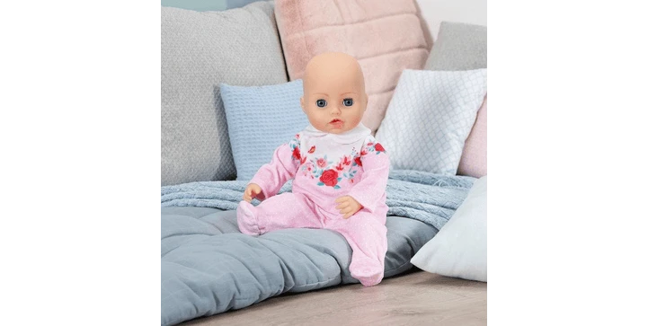Wie ein Röslein so fein, so chic ist Baby Annabells rosa Strampler. Der kuschelige Stoff ist über und über mit weißen Punkten bedruckt. Um das Dekolleté schmiegt sich eine Rosenranke. Es sieht fast so aus, als ob Baby Annabell eine Ehrenkette trägt; so eine, wie Bürgermeister und Königinnen haben. Das elegante weiße Krägelchen ist ein extra Hingucker.
