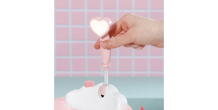 Tippt man den herzigen Knopf auf der Brause kurz an, hört man Wasser vor sich hinplätschern. Wird selbiger gedrückt gehalten, leuchtet das Herz im Duschkopf und erzeugt durch den Lichtstrahl die Illusion eines Wasserstrahls. Mit dem kann Baby Annabell dann spielerisch abgeduscht werden. Der einzigartige Badespaß wird begleitet von allerhand Wassergeräuschen.