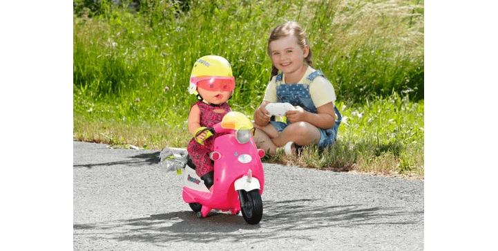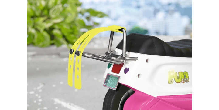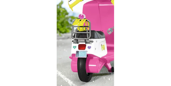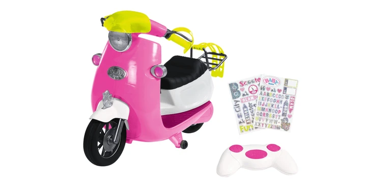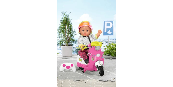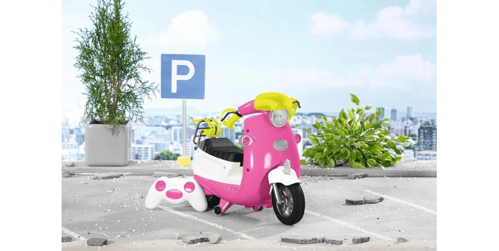 Das rosa Gefährt wird durch eine Fernbedienung gesteuert. Beim Abbiegen nach links und rechts leuchten die Blinker. BABY born sitzt dank der Handschlaufen am Lenker immer gut und sicher auf dem Zweirad. Der Gepäckträger bietet Platz für die ein oder andere Einkaufstüte. Und wer seinen Roller ganz individuell tunen möchte, der verziert ihn mit den coolen Glitzer-Stickern.