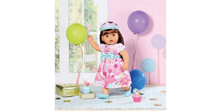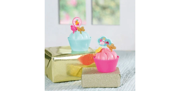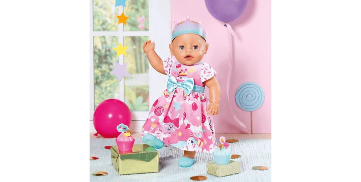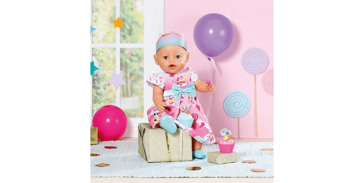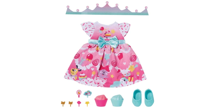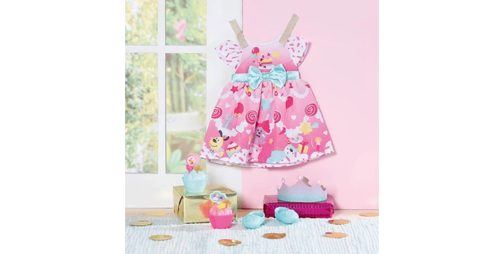 Das hübsche rosafarbene Kleid ist mit einem farbenfrohen Geburtstagsmuster bedruckt und hat eine schöne blaue Schleife um die Taille. Ein glitzerndes Geburtstags-Diadem und zierliche blaue Ballettschuhe vervollständigen den Look – alles für kleine Hände, um das Anziehen ihrer Lieblingspuppe zu üben. Aber was ist mit der Geburtstagstorte? Dieses Set enthält zwei Cupcakes in Puppengröße in Rosa und Blau, mit Toppern zum Verzieren des Zuckergusses!