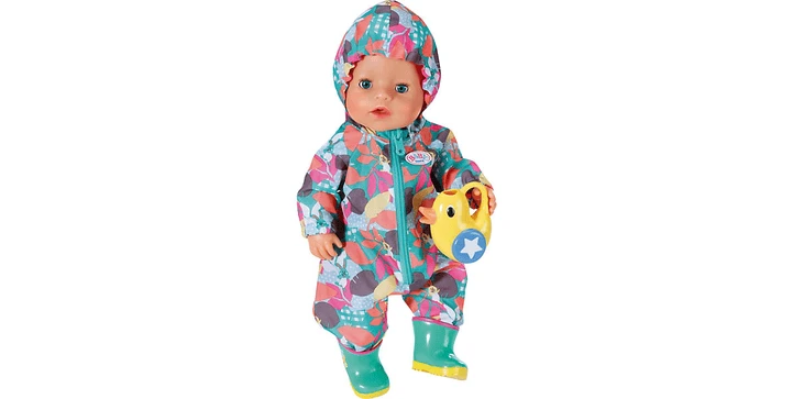 Frühlingszeit ist Pflanzzeit. Als erstes wird das Herbstlaub von den Beeten entfernt. Schwups, schon ist es auf BABY borns Overall gelandet. Der türkise Einteiler mit Kapuze und Reißverschluss an der Vorderseite ist über und über mit bunten Blättern bedruckt. In der matschigen Erde trägt die kleine Gärtnerin am besten Gummistiefel. Wenn die Stecklinge eingepflanzt und die Samen gesäht sind, dann wässert BABY born alles mit der Gießkanne in Entenform.