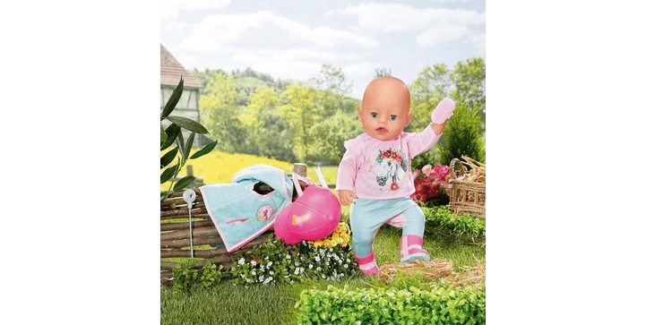 Wenn es auf ein Reitturnier geht, dann putzt BABY born nicht nur ihr süßes Pferchen heraus, sondern auch sich selbst. Mit dem türkis-pinken Outfit sieht sie auf ihrem hellbraunen Pony richtig chic aus.