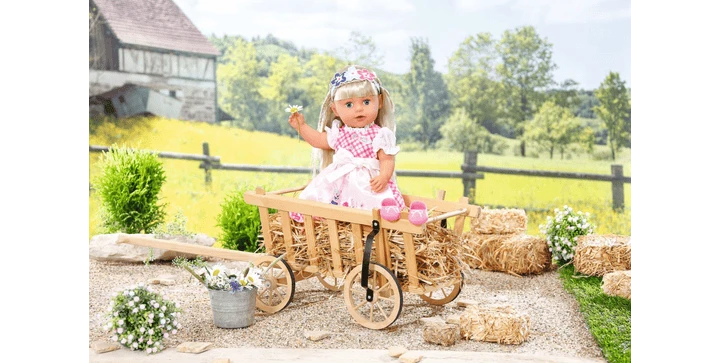 “Auf geht’s zum Oktoberfest BABY born“: in diesem feschen pink-karierten Dirndl mit blütenweißer Schürze mit Hase Benno-Druck machst du eine richtig gute Figur. Die angenähte Bluse mit Puffärmelchen macht das Dirndl komplett. Und für den Kopf ist noch ein chices Blütenhaarband dabei. BABY born trägt dazu bequeme pinkfarbene Ballerinas..