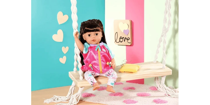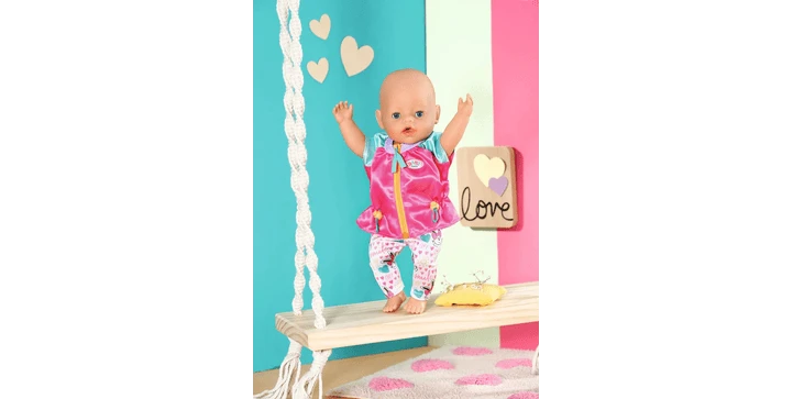 Zum Mini-Treff geht BABY born meistens in einem stylischen Outfit, das alles mitmacht und für jede Aktivität geeignet ist. Die pinke Jacke aus glänzendem Stoff hat türkise Einsätze an den Schultern und einen orange-farbigen Reisverschluss. Wenn sie gut sitzen soll – zum Beispiel, wenn sich BABY born kopfüber ans Klettergerüst hängt – dann kann die Jacke an der Taille per Gummizug gerafft werden. Dazu trägt die kleine Fashionista weiße Leggings mit buntem Druck. Das Pink von Hasenfreundin Bellas Schleife passt farblich perfekt zur Jacke.