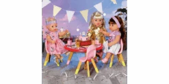 Zum Torten-Schmaus nehmen BABY born und ihre beiden Lieblingsgäste am Geburtstagstisch Platz. Die drei Stühle und der Tisch in Holz-Optik sind im top aktuellen skandinavischen Design gestaltet. Die Tischplatte ist mit süßen Geburtstagsmotiven verziert und hat in der Mitte einen Drehteller für die Torte. Das Mobiliar kann zusätzlich mit Stickern dekoriert werden.