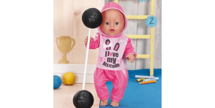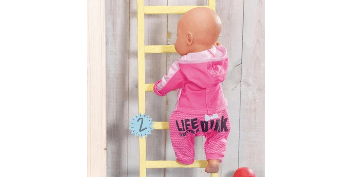 Und der erste Platz geht an… BABY born im blauen Jogginganzug. Mit ihr spielt es sich einfach am besten. Sie ist ja schließlich auch zum Spielen geboren – born to play – so steht es auch auf dem Kapuzenpulli. Sie hat einfach die richtige Einstellung (Attitude) und sieht das Leben durch die rosa-rote Brille. Ach, nein, der andere Jogginganzug ist wirklich pink und rosa. Die Hoodies sind herrlich bequem und schützen BABY borns Köpfchen, wenn der Wind mal etwas frischer weht. Die beiden Hosen in pink und blau haben putzige farbige Abnäher, als ob sie Taschen hätten und sind mit weißen Zick-Zack-Streifen versehen.