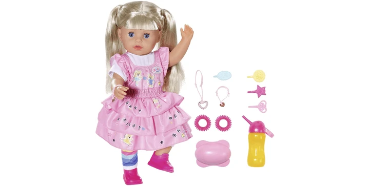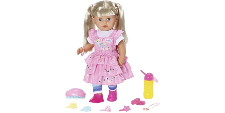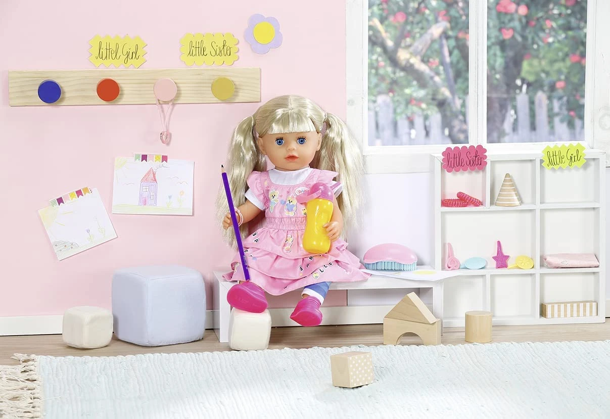BABY born Kindergarten Little Sister 36cm mit Kleid, Leggings und Schuhen. Inkl. Flasche, Bürste, 4 Haarclips, 2 Spiralgummis und je 1 Freundschaftsbändchen für Kind und Puppe.
