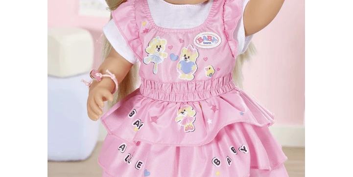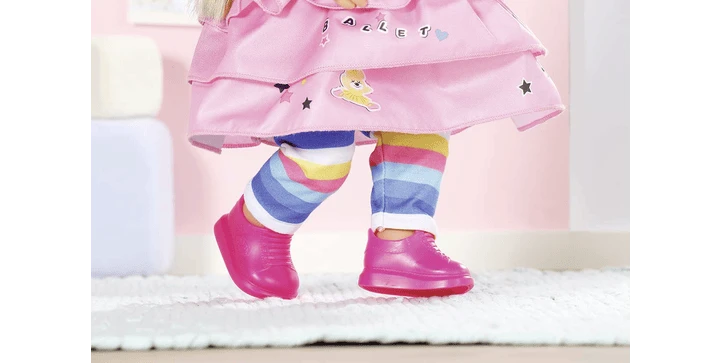 Schließlich ist sie schon groß und kann schon ganz alleine stehen. Neben ihren flexiblen Kniegelenken ist die Kleine generell sehr beweglich. Dadurch wird das An- und Ausziehen ihrer putzigen Kleidung zum Kinderspiel. Das Kleid im Lagen-Look hat Rüschenärmel und einen gestuften Rock. Passend zur Bärengruppe ist es mit Tanzbärchen bedruckt. Darunter trägt das Kindergartenmädchen bunt geringelte Leggings und pinke Turnschuhe.