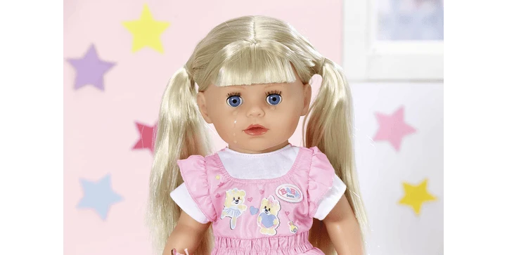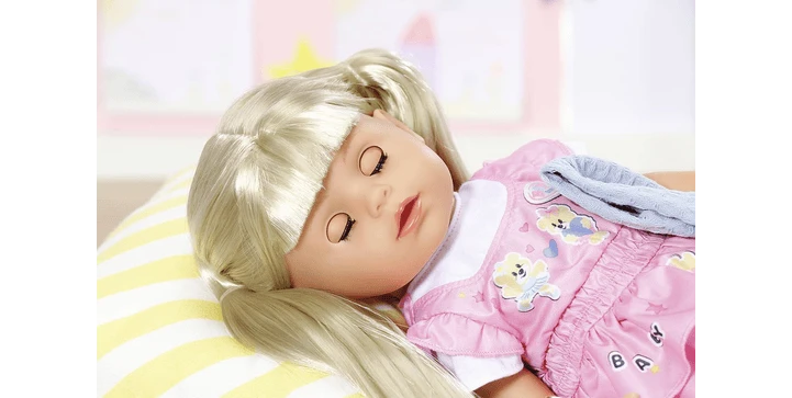 Ihr Wasser trinkt sie nicht mehr aus einem Nuckelfläschchen, sondern aus einer sportlichen Flasche. Wenn sie schlafen soll, gibt es immer ein bisschen Gezeter und echte Puppentränen fließen. Sie ist ja schon eine Große, warum soll sie also schlafen? Wenn man sie auf den Rücken legt, schließt sie aber brav die Schlafaugen. Außerdem liebt sie es gebadet zu werden und die Haare frisiert zu bekommen. Dafür bringt sie allerhand Haar-Accessoires mit.