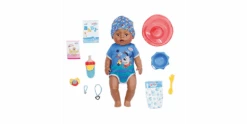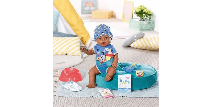 Schlafen, Baden und Essen sind des Boys Lieblingsbeschäftigungen. Er trinkt gerne Wasser aus seinem Fläschchen und kann dann Pipi in die Windel oder ins Töpfchen machen und echte Puppentränen weinen. Neben Wasser steht der BABY born Brei auf dem Speiseplan. Dann macht er sogar sein großes Geschäft. Seine Arme, Beine und der Kopf sind super beweglich, so dass das An- und Ausziehen der coolen Kleidung zum Kinderspiel wird. Der Soft Touch Körper ist angenehm weich.
