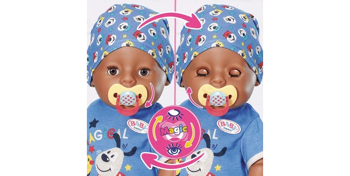 Der Junge mit 10 lebensechten Funktionen, die alle ohne Batterie funktionieren, schließt und öffnet mit Hilfe des Schnullers magisch die Augen.