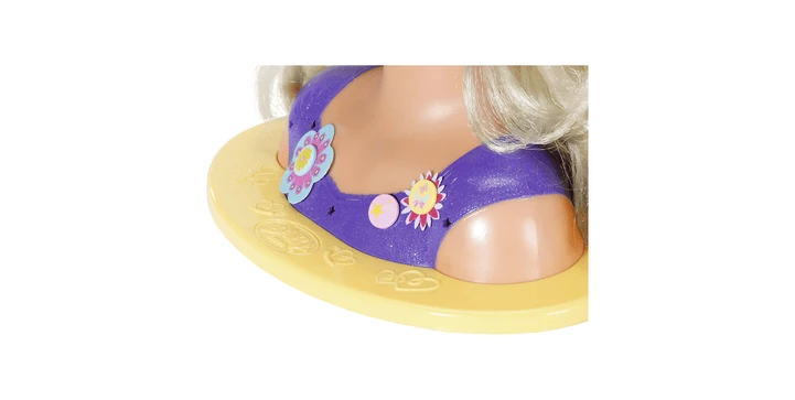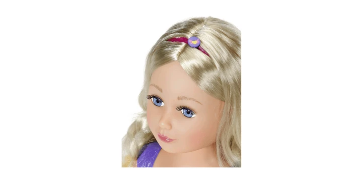Egal, ob wild verstrubbelte Mähne, ordentlich nach hinten gebundener Schopf oder aufwendig geflochtener Zopf, das qualitativ hochwertige Haar ist für alle Frisuren geeignet. 4 Haargummis, 2 Klammern und die Bürste helfen beim Hairstyling. Das pinke Haarband kann in die Frisur integriert und mit Blüten und Pins verziert werden. Die Blumendekoration passt auch prima zum und ans lila Top.