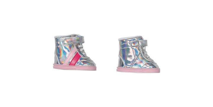 BABY born tritt ins Spektrum der coolsten Schuhe ein. Man sieht die holographischen Stiefelchen schon von Weitem funkeln. Seitlich sind die trendigen Treter mit Streifen in pink und rosa verziert. Gut verschnürt und mit Klettverschluss befestigt, kann BABY born damit bis zum Mond laufen.