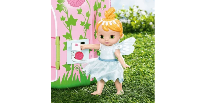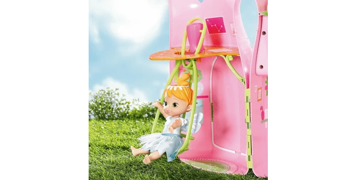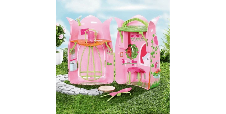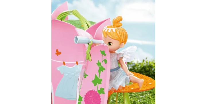 Ein Spielhaus für die Bewohner der Storybook-Welt. Öffnet man die Behausung in Blütenform, bekommt man Einblick in eine fabelhafte Feen-Wohnung mit vielen Spielideen und Accessoires. Das Wohnzimmer ist mit einem Tisch und einem Kamin ausgestattet. Im Spielzimmer hängt eine Schaukel von der Decke. Die Box an der Wand dient während der Schaukelei zum Beispiel als Stauraum für den Zauberstab. Man kann es sogar im ganzen Storybook-Land hören, wenn jemand im Blütenhäuschen verträumt hin und her schwingt. Dann klingelt die blumige Glocke, die am oberen Ende der Schaukel befestigt ist. An der Brüstung der ersten Dachterrasse kann ein Fernrohr befestigt werden. Hier hat man die nächste Geschichte immer gut im Blick und kann Ausschau nach den zauberhaften Freundinnen halten. Nach ihren Abenteuern entspannen sich die Storybook-Ländler im Liegestuhl auf der zweiten Dachterrasse. Der Griff, der aussieht wie überdimensionale Gräser, dient als Schattenspender. An ihm kann das geschlossene Häuschen auch von A nach B befördert werden.