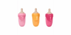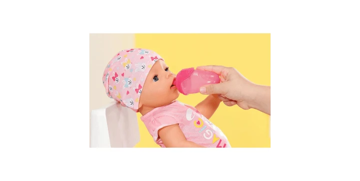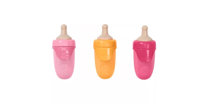 Von außen sieht es aus, wie roter Früchtetee, rosa Erdbeermilchshake und gelber Orangensaft. Was mag da wohl im Inneren sein? Der Deckel der bunten Flaschen hat die Anmutung eines richtigen Babysaugers. Nimmt man das Oberteil ab, findet sich darunter der Trinkpin, mit dem BABY born gefüttert werden kann.