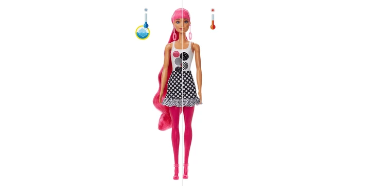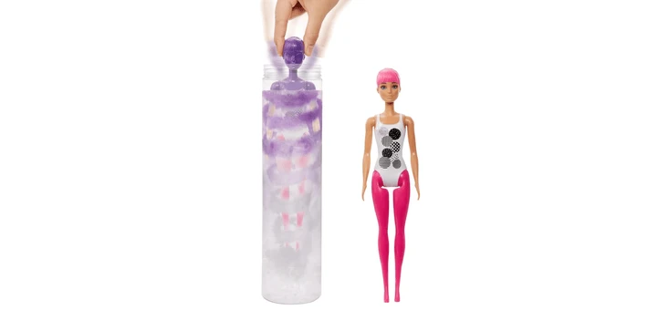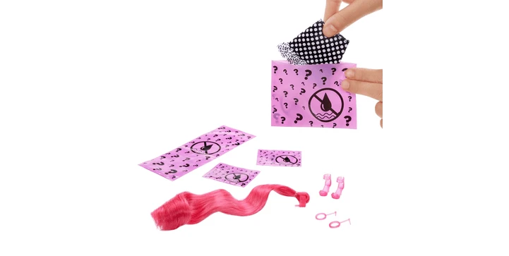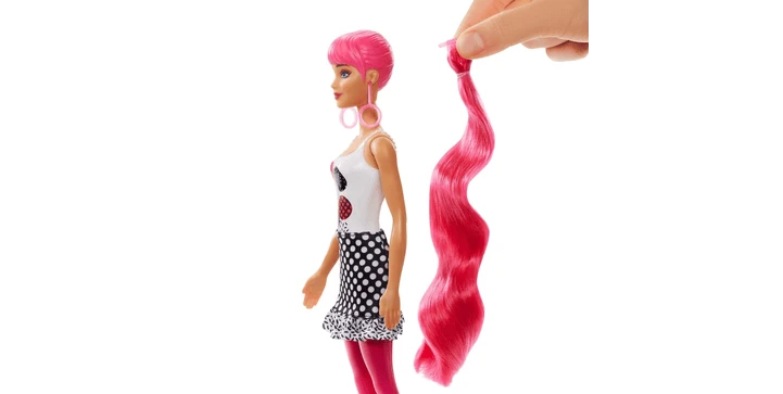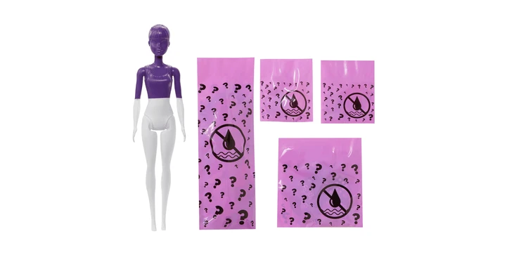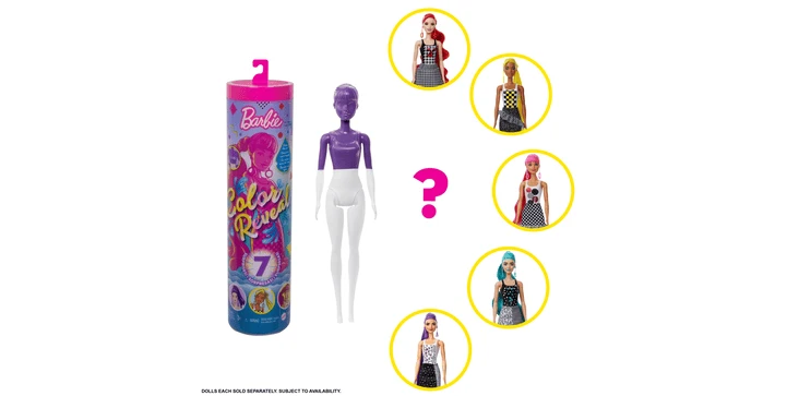 Barbie Color Reveal Puppen bieten ein Unboxing-Erlebnis voller Überraschungen – sieben davon! Eine Puppe, die eine trendige Mode trägt, ist garantiert, aber das Aussehen jeder Puppe bleibt ein Rätsel, bis sie enthüllt wird. Die Verpackung ist Teil des Spaßes – ziehen Sie am Streifen, um die äußere Schicht zu entfernen und ein klares Rohr freizulegen. Im Inneren befinden sich eine mysteriöse, farbblockierte Puppe in Weiß und Lila sowie vier Taschen, in denen Überraschungen versteckt sind. Entfernen Sie sie alle und füllen Sie das Röhrchen mit warmem Wasser, setzen Sie die Puppe ein und drehen Sie sie herum. Das Wasser färbt sich hellviolett, und wenn die Puppe herausgezogen wird, werden ihre Gesichtszüge sichtbar. Jede Puppe hat eine andere Kombination aus Augenfarbe, geformter Haarfarbe, Hautton, verziertem Oberteil und farbig geformten Beinen, aber die Überraschungen öffnen sich weiter Taschen, um ein helles Pferdeschwanz-Haarteil, einen gemusterten schwarz-weißen Rock und passende Schuhe und Ohrringe zu entdecken. Farbwechsel auf den Lippen der Puppe und das verzierte Oberteil sorgen für Überraschung und Spaß. Jede Serie hat ein einzigartiges Thema. Bei diesen Color Reveal-Puppen dreht sich alles um kräftige Muster und leuchtende Farben, um einen coolen Farbblock-Look mit farbig geformten Haaren und Beinen und hellen Haarteilen zu erzielen. Verwenden Sie die Tube, um diese und andere Lieblingszubehörteile von Barbie aufzubewahren. Welche Puppe wirst du enthüllen? Kinder können sie sammeln, um Accessoires zu kombinieren und die Möglichkeiten zu erweitern. Jeweils separat erhältlich, je nach Verfügbarkeit. Puppe kann nicht alleine stehen.