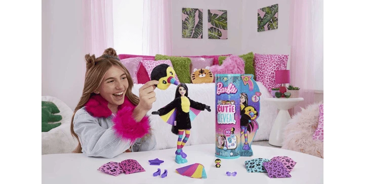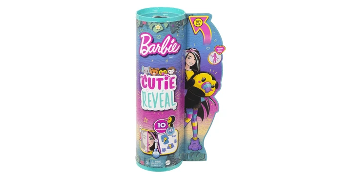 - Die Barbie Cutie Reveal Barbie-Puppe der Dschungel-Reihe bietet 10 Überraschungen in nur einer Verpackung. Schon das Auspacken ist mit den Plüschtierfreunden, den Moden und dem Farbwechselspaß ein besonders Erlebnis.