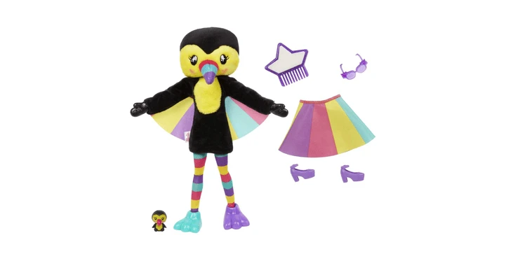 - Auspacken und einen wunderschönen Plüschtukan entdecken, der eine Barbie-Puppe verbirgt.