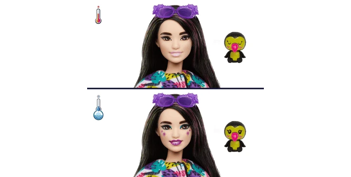 - Mithilfe von eiskaltem Wasser verändert sich das Gesicht mit lustiger Dschungelbemalung der Barbie-Puppe und die Augen des Mini-Haustiers öffnen und schließen sich. Mit warmem Wasser verschwindet das Design wieder. Jedes Mal wieder ein toller Spaß!