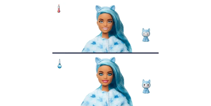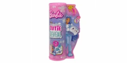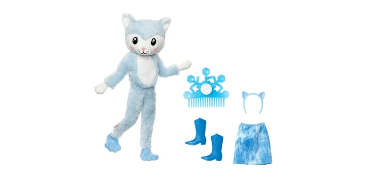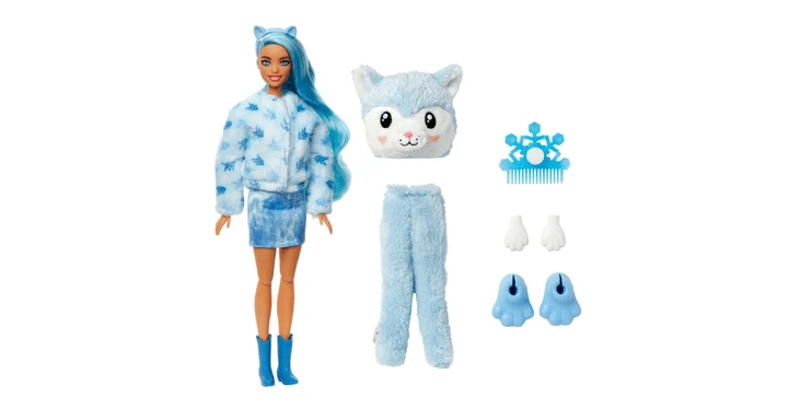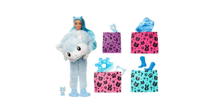 Die Packung enthält 10 Überraschungen, darunter eine bewegliche Barbie-Puppe. Die Packung enthält einen weichen Plüschhuskywelpen mit Glitzerfell und vier Überraschungstüten. Unter dem Huskykostüm befindet sich eine Barbie-Puppe mit langen, eisblauen Haaren und hübschen Details. Im Inneren der Überraschungstüten befinden sich ein süßer Rock, ein Haareif, ein Schwamm-Kamm und ein Huskywelpe als Mini-Haustier. Kinder können die Barbie-Puppe ankleiden und stylen – durch Umdrehen kann das Oberteil des Kostüms als wunderbar weiche Fleece-Jacke getragen werden und der Kopf des Kostüms wird zum Körbchen für das Haustier. Der Farbwechsel sorgt für weitere Überraschungen. Auf dem Gesicht der Barbie-Puppe erscheint eine winterliche Tierbemalung und ihr Husky „öffnet und schließt“ seine Augen.