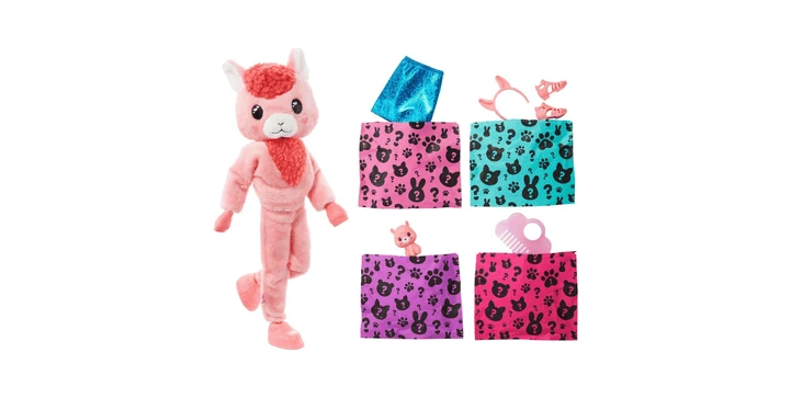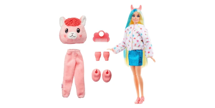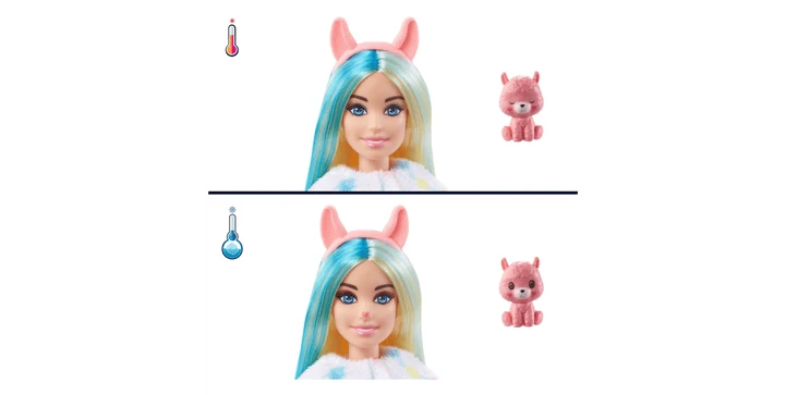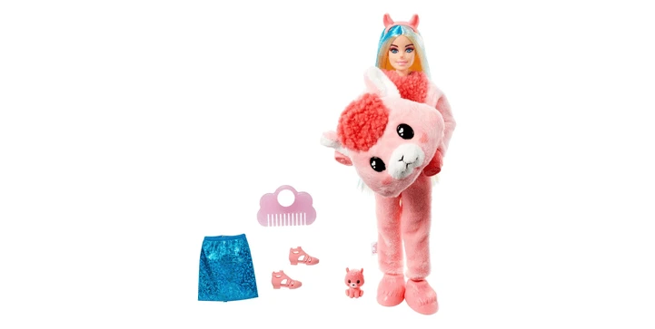 Öffnen Sie die Verpackung und entdecken Sie ein weiches, kuscheliges Lama und 4 Überraschungstüten. Wenn Sie den Lama-Anzug ausziehen, kommt eine Barbie Puppe mit langen Haaren und glänzendem Glitzer zum Vorschein. Öffnen Sie die Überraschungstüten, um schöne Kleidung, Accessoires, einen Schwamm/Kamm und ein Mini-Lama zu finden. Kinder können sich verkleiden und der Barbie -Puppe Accessoires geben. Das Oberteil des Kostüms lässt sich umstülpen und als superweiche Fleecejacke verwenden und der Kopf des Kostüms verwandelt sich in einen Tierkorb! Aber es gibt noch mehr Überraschungen mit dem kuscheligen Farbwechsel. Tierisches Make-up erscheint auf dem Gesicht der Barbie -Puppe und ihr Mini-Lama öffnet und schließt die Augen.