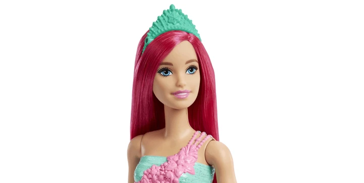 - Sie trägt ein abnehmbares türkisfarbenes Diadem im langen, rosafarbenen Fantasiehaar und passende Schuhe zur Vervollständigung des königlichen Looks.