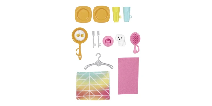 - Kinder können direkt loslegen und Geschichten mit dem süßen Hündchen, der spaßigen Einrichtung und den Zubehörteilen erzählen, zu denen ein Esstisch mit einer Steckvorrichtung, Esstischstühle, Geschirr, eine gemütliche Decke und mehr gehören.