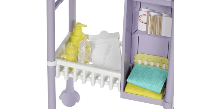 - Zum Spielzubehör gehören ein Untersuchungstisch mit Lotionsflasche und weiterem Zubehör zur Behandlung von kleinen Patienten, ein Mobile und durchsichtige Ablagen für die 2 Baby-Puppenpatienten.