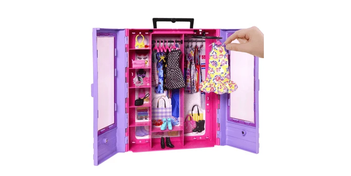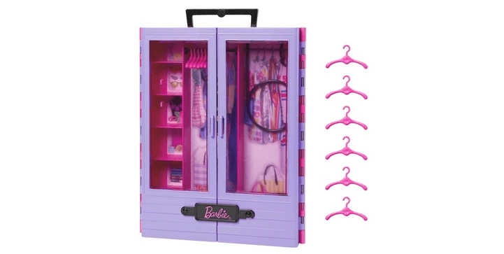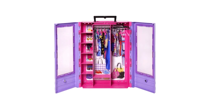 Barbie Kleiderschrank mit Tragegriff (lila/rosa) ausklappbar mit Zubehör