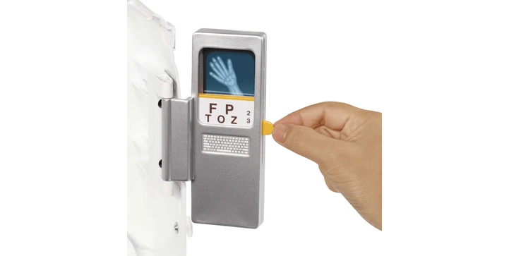 - Aus dem Röntgengerät im Behandlungsraum wird mit einem Griff eine Tafel für Sehtests.