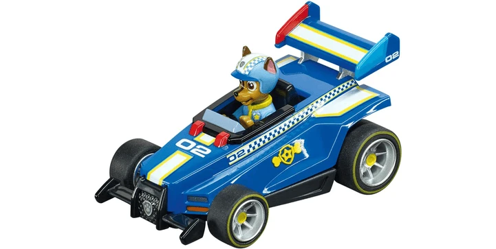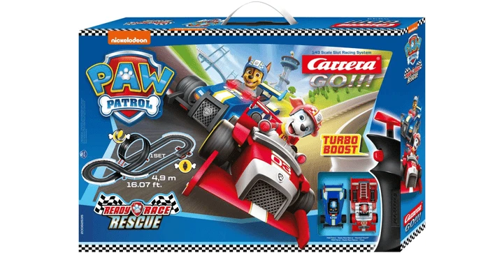 Auf der 4,9 Meter langen Carrera GO!!! Autorennbahn flitzen der Hundeheld Chase in seinem coolen, blauen Polizeiwagen und der schusselige Dalmatiner Marshall im roten Feuerwehrauto um die Wette. Auf den himmelblauen Schienen bestimmst du, welche Aufgaben Chase und Marshall in deinem Kinderzimmer lösen dürfen.