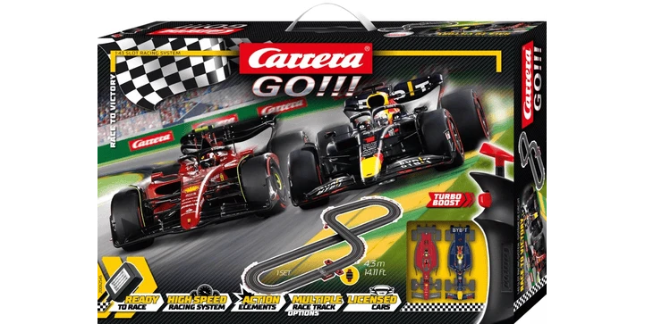 Mit dem Carrera GO!!! Set „Race to Victory“ flitzt du den beliebten Formel 1 Fahrzeugen von Ferrari und Red Bull Racing. Der Ferrari Bolide Ferrari F1-75 „Sainz, No.55“ in klassischem Rot kämpfte in der vergangenen Saison auf der großen Rennstrecke häufig mit dem blauen Red Bull Rennwagen Red Bull Racing RB18 „Verstappen, No.1“ um die bessere Platzierung.