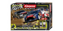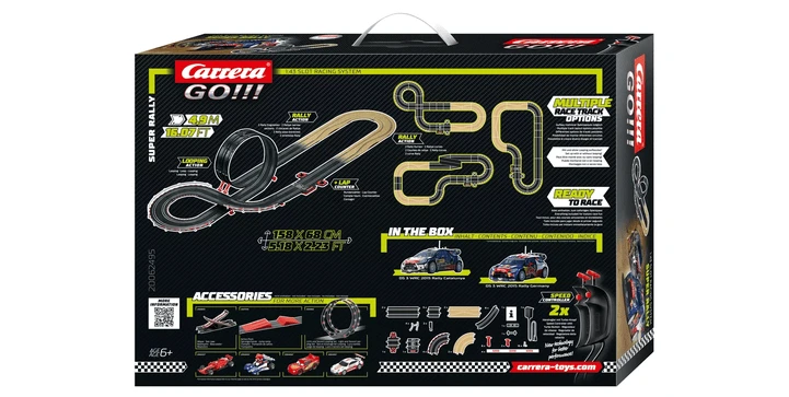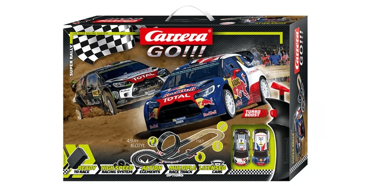 Damit auch Du die Anziehungskraft der staubigen und rutschigen Rallye-Rennen kennen lernen kannst, bringt diese Carrera GO!!! Strecke mit 4,9 Metern und einem Maßstab von 1:43 das Feeling zu Dir nach Hause. Die beiden Rennwagen Citroën DS3 WRC im Maßstab 1:43 unterscheiden sich nur durch ihre Lackierung. Die Schienenelemente mit Geraden und Engstellen im besonderen Rally-Design sorgen für weitere raffinierte Bahnelemente auf der Strecke. Durch die Betätigung des Turbo-Buttons am Controller kannst Du – vor allem im Looping – Du richtig Gas geben.