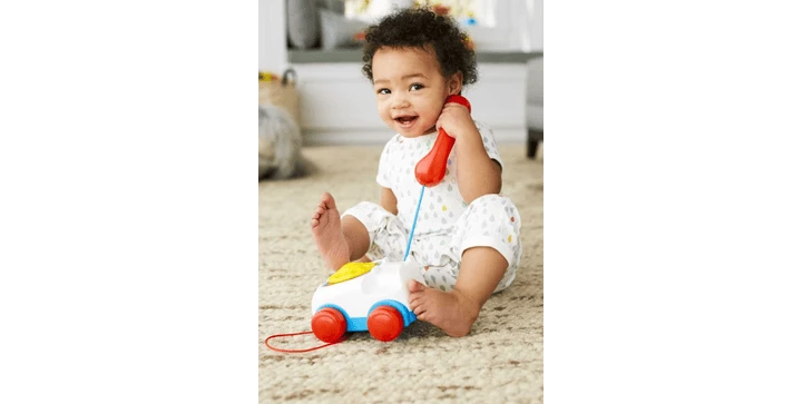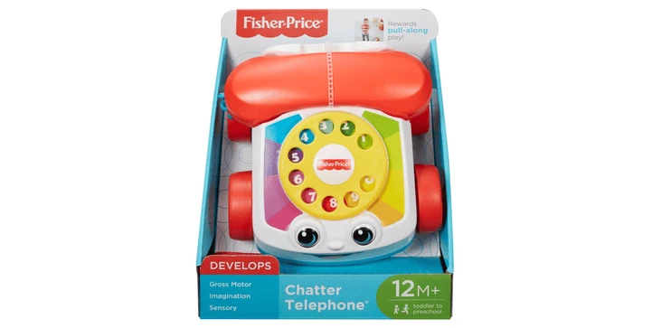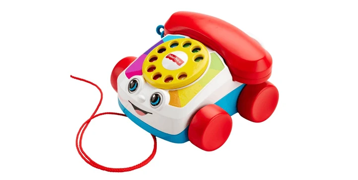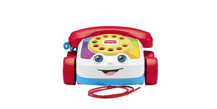 Lustiges Telefon, das beim Nachziehen mit den Augen rollt und plappert“. Klingelt beim Drehen der Scheibe.