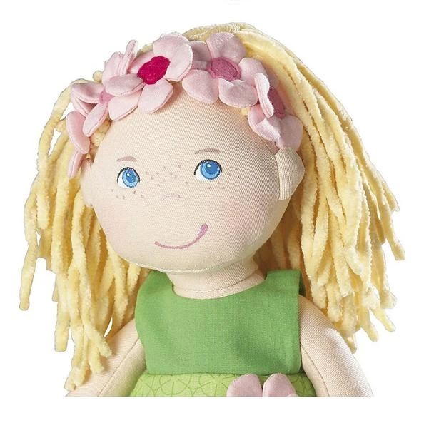 Ein echter Sonnenschein ist die HABA-Puppe Mali. Am liebsten pflückt sie Blumen. Aus ein paar rosafarbenen Blüten hat sie sich ein Blumenhaarband gebunden. Ihr Sommerkleid ist so grün wie eine Sommerwiese, auf dem ebenfalls eine Blume blüht. Die HABA-Puppe Mali regt Kinder ab 18 Monaten zum Kuscheln, Schmusen und zu ersten Rollenspielen an. Und wie alle HABA-Puppen hat Mali einen wattierten Körper und ein mit Fäden aufgesticktes Gesicht. Ihr sonnenblondes Haar aus weichen Fäden kann man frisieren, mit dem Blumenhaarband bändigen oder zu Zöpfen flechten.