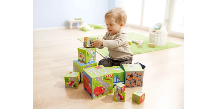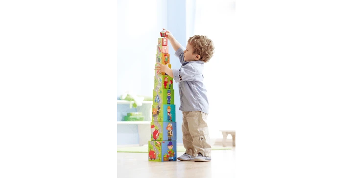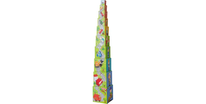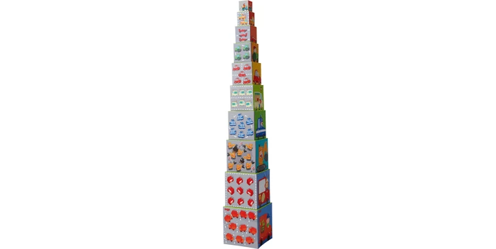 - spannende Stapelwürfel mit vielfältigen Spielmöglichkeiten: ineinander stecken, Reihen legen, Turm stapeln