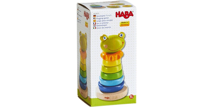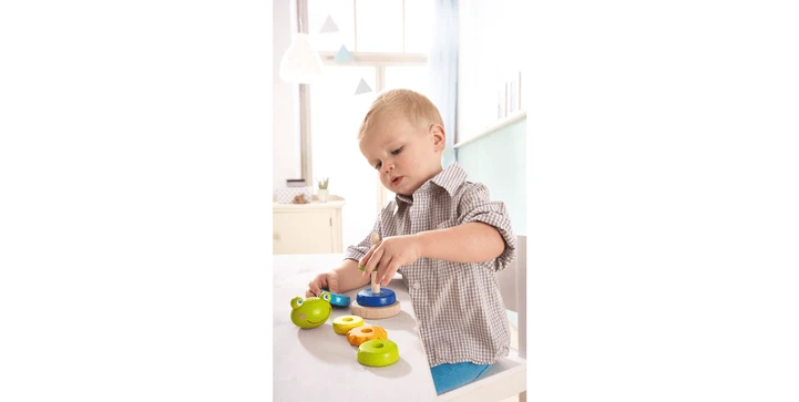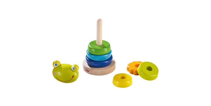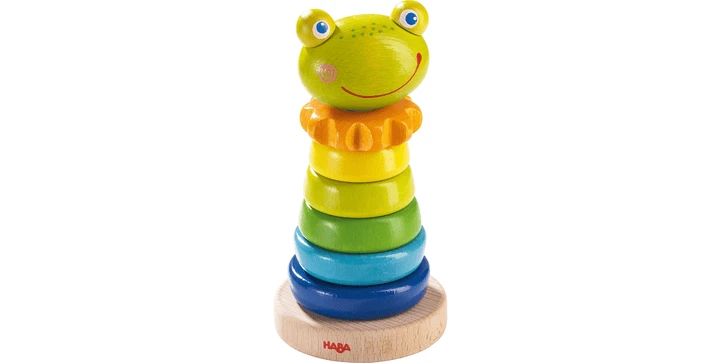 Wie groß ist der farbenfrohe Frosch? Das können Kinder herausfinden, indem sie Stück für Stück die einzelnen Holzteile aufeinanderstecken.
