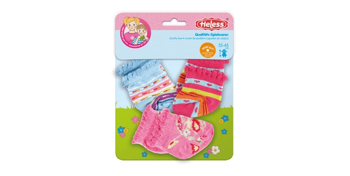 Die bunten Puppensöckchen von Heless setzen modische Akzente. In drei unterschiedlichen Varianten erhältlich peppen sie jedes Puppen-Outfit auf. Die Söckchen sind sehr elastisch und können somit unterschiedlichsten Puppen kinderleicht an- und ausgezogen werden. Diese Söckchen passen den meisten marktgängigen Puppen der Größe 35-45 cm. Sie sind auch in einer weiteren Ausführung für Puppengröße 28-35 cm erhältlich.