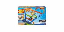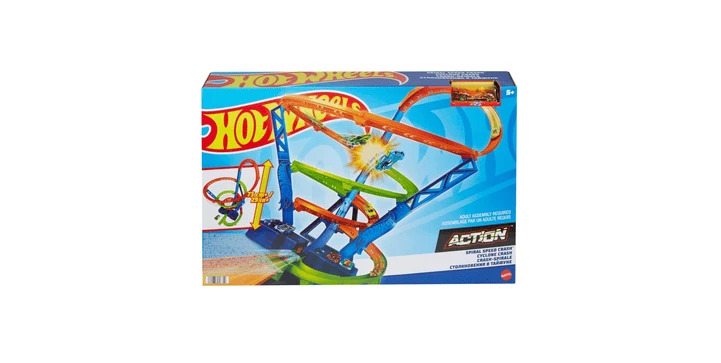 - Das actiongeladene Hot Wheels Crash-Spirale-Trackset sorgt für rasanten Nervenkitzel in einem 73 cm hohen Trackset mit mehreren Crash-Zonen und batteriebetriebenem Beschleuniger.