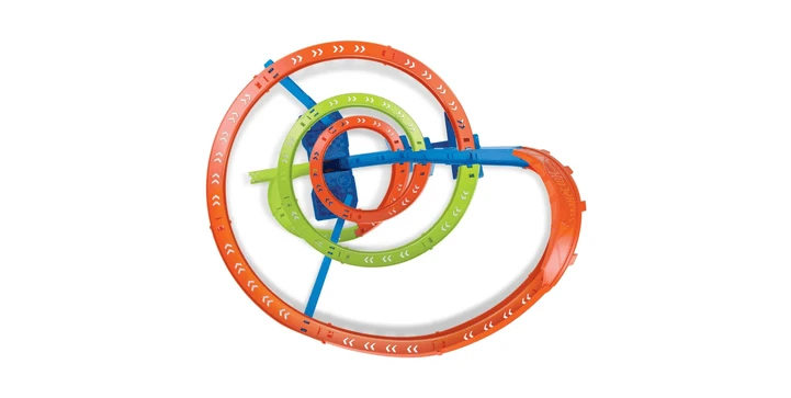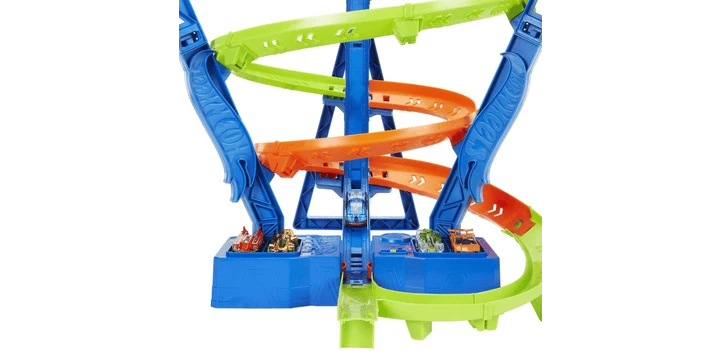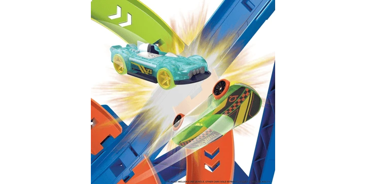 - Kinder fahren mit ihrem Lieblingsfahrzeug von Hot Wheels auf den Beschleuniger, der es an die Spitze des Tracks katapultiert und dafür sorgt, dass die Autos ununterbrochen rasen, bis es zu einem Crash kommt.