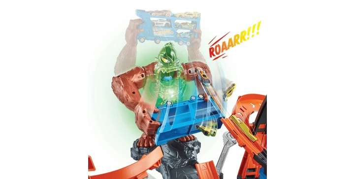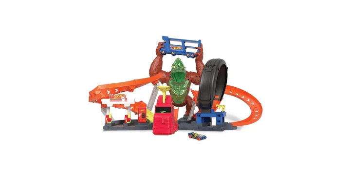 Mit dem Hot Wheels Slam Gorilla Spielset können Kinder ihren Feind mithilfe von epischen Stunts besiegen.