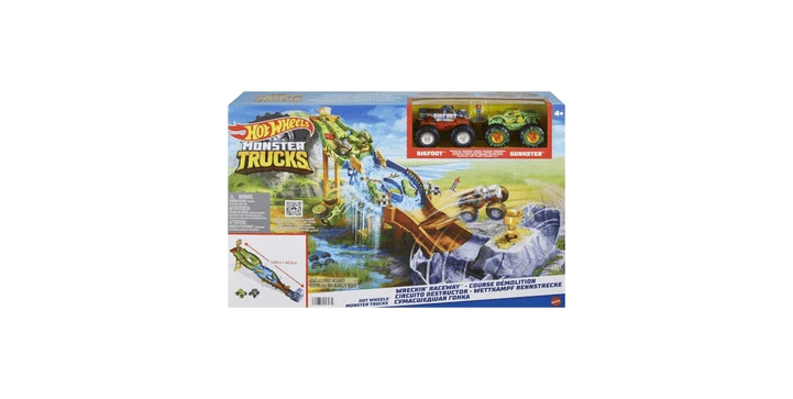 - Das Spielset umfasst 2 Hot Wheels Monster Trucks Bigfoot und Gunkster , damit das Rennen gleich losgehen kann.