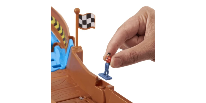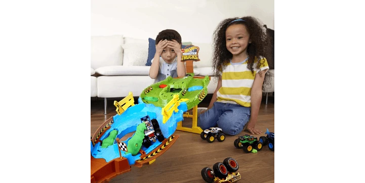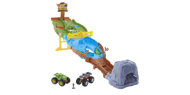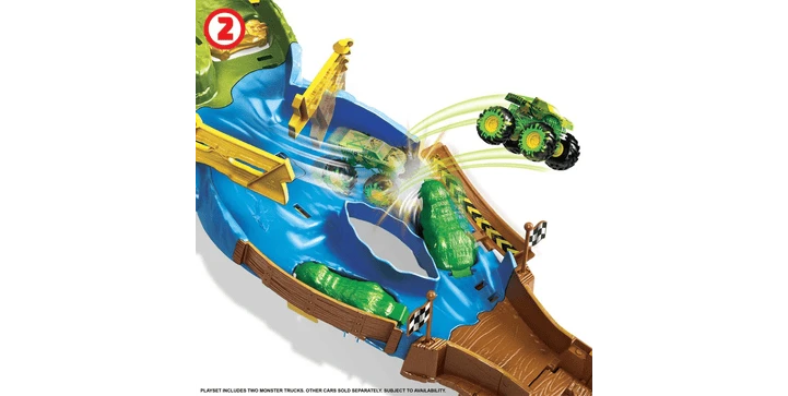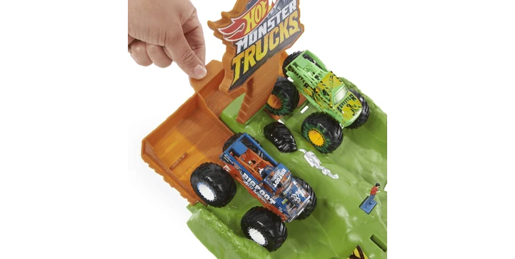 Wie in den legendären Downhill-Rennen der YouTube Serie Hot Wheels Monster Trucks“ rasen Bigfoot und Gunkster den Hügel hinunter, fahren über zerstörbare Autos und durch eine Reihe von Hindernissen und krachen schließlich durch die Höhle, um den begehrten Champions Cup zu gewinnen. Der erste Truck, der über die Brücke fährt, löst eine Explosion“ aus. Der zweite Truck und der Sprecher fliegen durch die Luft. Das Spielset lässt sich zum Tragen und Verstauen zusammenklappen. Abweichungen in Farbe und Gestaltung vorbehalten.