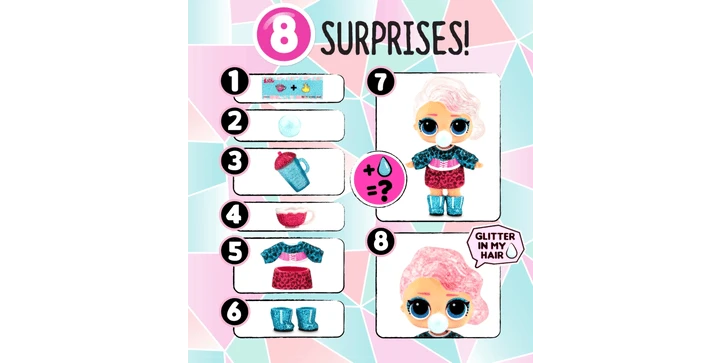L.O.L. Surprise Glitter Globe Püppchen haben einen ganz neuen Look und im Haar schwebt Glitzer, wenn das Püppchen trinkt. Packe eine von 12 süßen