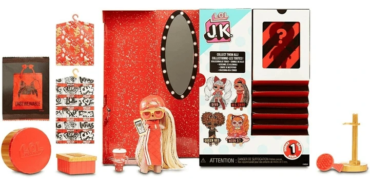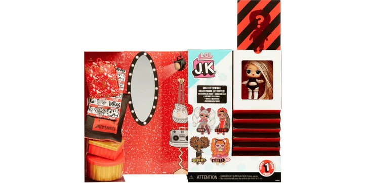Erlebe ein unfassbares Unboxing-Erlebnis mit den J.K. Fashion Dolls von L.O.L.. Dich erwarten 15 verschiedene Überraschungen und die Puppe besitzt jetzt echtes Haar. Öffne die Rückwand, um deine Mini-Modepuppe zu enthüllen, und öffne dann die Seite, um deine Überraschungen zu enthüllen. Ziehe Diva ihre echte, wilde Mode und ihre echten hohen Schuhe an. Lasse sie eine Pose einnehmen, um sie auf ihrem mitgelieferten Puppenständer zu zeigen. Dein Karton wird sogar zu einem Ankleidezimmer-Spielset.