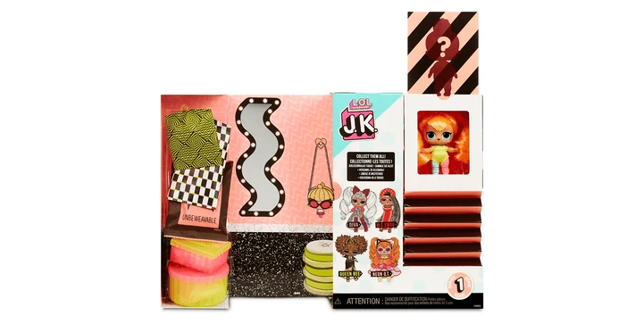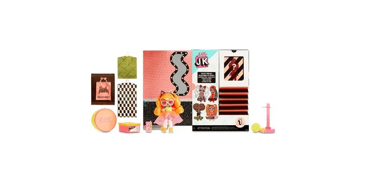 Erlebe ein unfassbares Unboxing-Erlebnis mit den J.K. Fashion Dolls von L.O.L.. Dich erwarten 15 verschiedene Überraschungen und die Puppe besitzt jetzt echtes Haar. Öffne die Rückwand, um deine Mini-Modepuppe zu enthüllen, und öffne dann die Seite, um deine Überraschungen zu enthüllen. Ziehe Diva ihre echte, wilde Mode und ihre echten hohen Schuhe an. Lasse sie eine Pose einnehmen, um sie auf ihrem mitgelieferten Puppenständer zu zeigen. Dein Karton wird sogar zu einem Ankleidezimmer-Spielset.